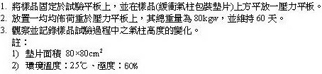 再0.8x0.8m²的3cm直徑的氣柱墊片上,放置一塊80kgw壓力的平板,觀察並紀錄60天的試驗過程中之氣柱高度的變化。 | 壓力下之高度 (mm) |